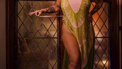 The antique expert and burlesque dancer wore a sleeveless denim jumpsuit with a floral pattern, showing off her selection of colorful tattoos.